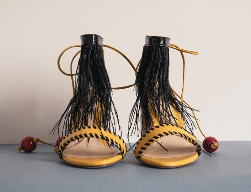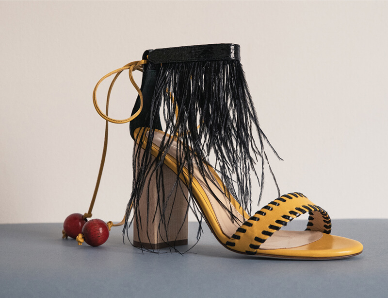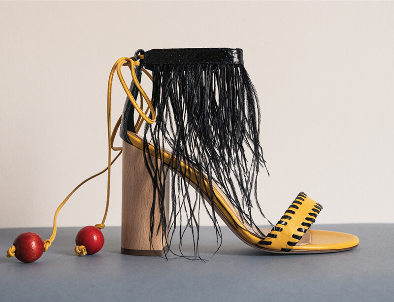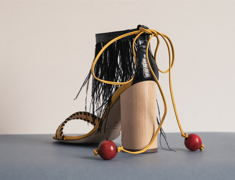 HEELED SANDALS WITH FEATHER AND WOODEN BUTTON DETAILS. MADE IN ITALY